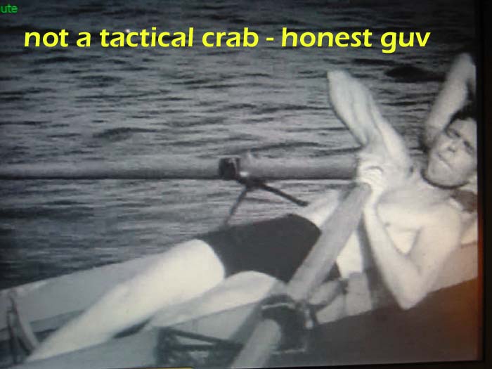 The race involves footage of two semi-nekkid rowing crews (the actors) intercut with what looks suspociously like Harvard-Yale clothed boatrace footage, including a nice shot of rowing spectators being driven down the course on moveable seating on railway tracks.