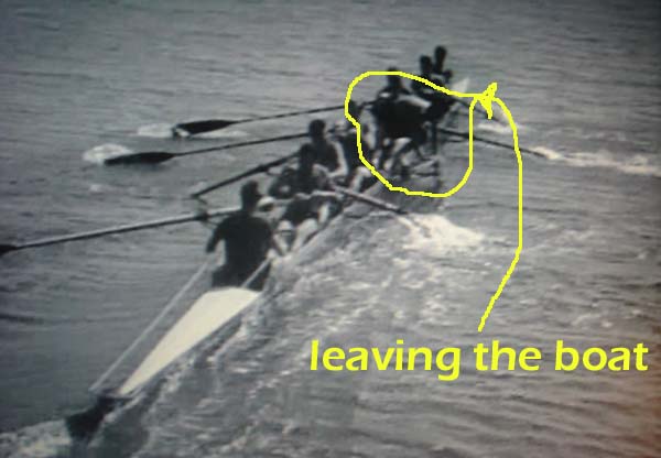 The rest of his crew then start to undo their oars, fling them out of the boat and follow, in an attempt to make it look like a capsize (but as any fule kno, that doesn't happen in real life).